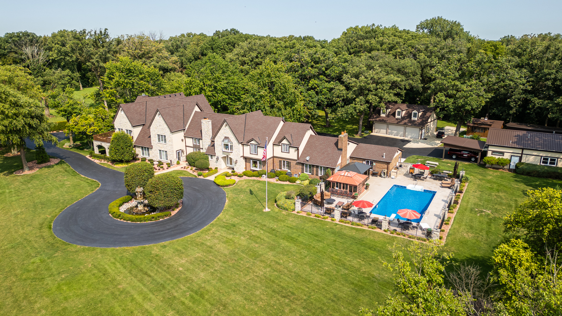 This estate is a true masterpiece of luxury, comfort, and privacy-nestled on nearly 11 meticulously landscaped acres. Offering over 10,000 square feet of beautifully designed living space, the residence combines timeless elegance with thoughtful functionality. A gated entrance leads to this private sanctuary, which features a heated six-car garage and two fully equipped guest apartments-ideal for extended stays or multigenerational living. The main home includes a spacious main-floor bedroom suite for added convenience. Two sprawling living rooms offer abundant space for entertaining and relaxation, one featuring a built-in bar. A formal dining room sets the stage for elegant gatherings, while a charming breakfast room offers a more casual spot to enjoy morning meals. The gourmet kitchen is designed for the discerning chef, equipped with a full-size Sub-Zero refrigerator and freezer, two dishwashers, and a professional-grade six-burner range with griddle. The showstopping master suite spans an impressive 38' x 37' and includes a private balcony, tanning room, fireplace, and three massive walk-in closets. The luxurious master bath is outfitted with spa-quality finishes, creating a private retreat. Additional interior highlights include a state-of-the-art theater room with a 12-foot screen, a game room with hot tub, a cozy sitting room with built-in bar, a well-equipped exercise room with professional flooring, a bright Florida room, and an executive office filled with natural light. The outdoor amenities rival those of a private resort. A heated in-ground swimming pool and spa house provide the ultimate relaxation, while resurfaced tennis courts (2024), decorative fountains, a charming gazebo, and a 30' x 50' heated pole barn offer year-round enjoyment. The estate is fully fenced and secured with an advanced security system, ensuring both privacy and peace of mind. Recent upgrades include new roofs on all structures (2022/2023), gutters and soffits (2023), all air conditioning units replaced (2024), furnace rebuild (2019), water heater (2022), and a new driveway (2023). Interior updates include new carpet (2024), luxury vinyl tile flooring (2024), updated kitchen lighting, and newly upgraded pool equipment (2024) with a liner installed in 2023. Even the cedar shed received a full update in 2024. Set well off the main road behind stately gates, this extraordinary estate offers a rare opportunity to enjoy refined living in a truly private and serene setting.