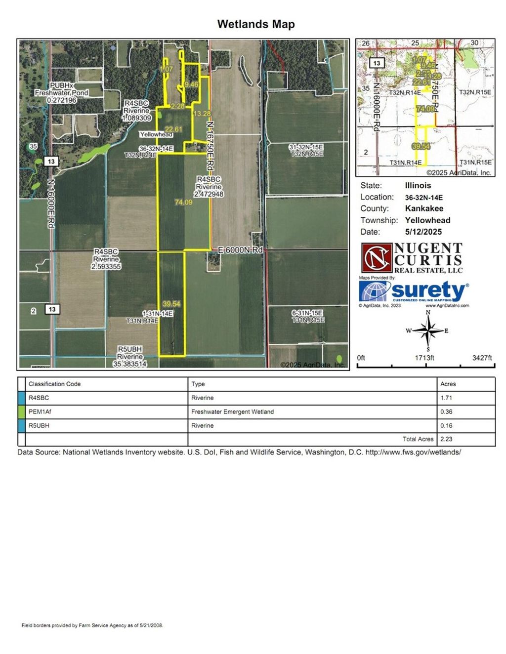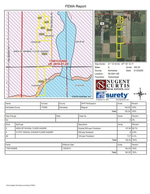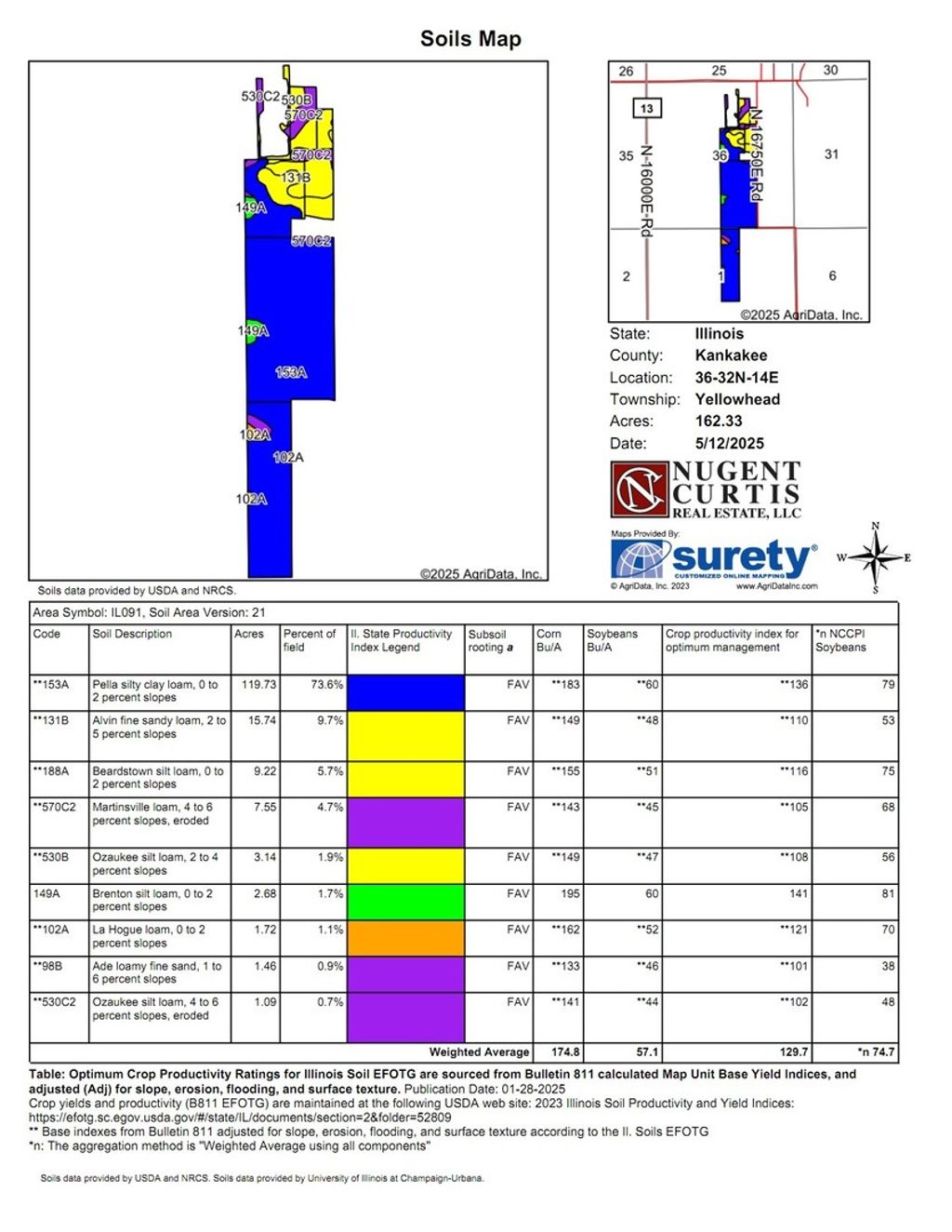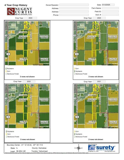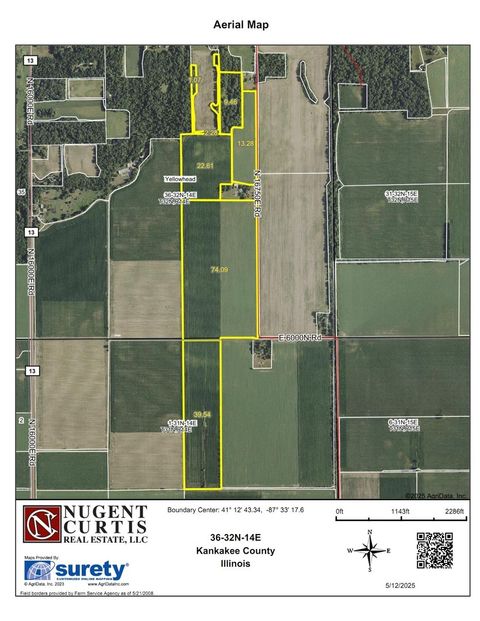 162+/- acres farmland for sale. 148+/- tillable with 14+/- timber. PI of 129.7. Priced at $12,000 per acre. Yellowhead Township, Section 36. Momence Township, Section 1. Farm is leased for 2025. Open for 2026 lease. Homesite not included in sale. Taxes reflect inclusion of homesite which will be divided off prior to sale.