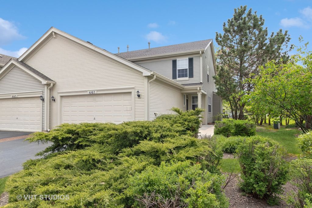 Great opportunity to get into home ownership with this 2-story updated townhome featuring a 9 foot ceiling, an open concept design creating an airy and spacious feel. Major updates are new vinyl tile flooring on first level and new plush carpet on the second level. The dining room has new canned lighting. The kitchen boasts of white cabinets, new quartz countertop, new dishwasher, new disposal and canned lighting. It has a space for a table and opens up to a patio & backyard. It also flows freely into the family room accentuated by a brick fireplace. A powder room, small storage and utility space for mechanicals complete the first level. The master bedroom features an ensuite bathroom with new quartz vanity top, dual sink, new mirrors, light fixtures, and faucets. A small linen closet is also situated in this bathroom. The generous sized master bedroom also features a huge walk in closet. The second bedroom is also well sized with a dedicated updated bathroom. The convenience of a second floor laundry with newer ( 5 yr ) washer dryer and vinyl tile complete the second level. All bathrooms feature new commodes. Roof and siding were replaced in 2022; range hood, a/c capacitor are newer, vents professionally cleaned. Entire unit has been professionally painted in neutral tones. An end unit with an attached 2 car garage is perfect for storage and parking. Location has access to various amenities including pool, clubhouse and park. Hurry this won't last long.